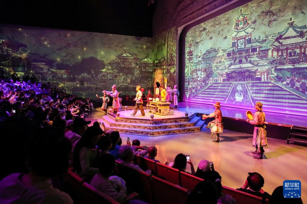 5月9日晚,游客观看大型洞窟式沉浸体验剧《乐动敦煌》。